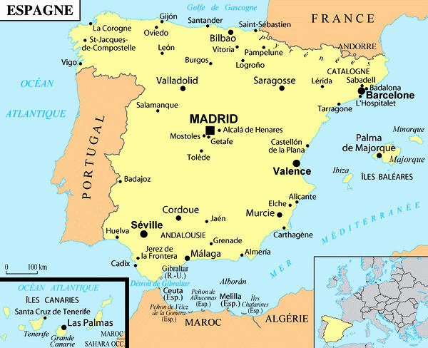 L’Espagne est bordée par la mer Méditerranée au sud et à l'est, à l'exception du territoire britannique de Gibraltar et le détroit du même nom qui sépare le continent européen de l'Afrique. Au nord, les Pyrénées constituent une frontière naturelle avec la France, l'Andorre, et le golfe de Gascogne. Le Portugal et l'océan Atlantique bordent l'ouest et le nord-ouest. Le territoire espagnol inclut également les îles Baléares en Méditerranée, les îles Canaries dans l'océan Atlantique au large de la côte africaine, et deux cités autonomes en Afrique du Nord, Ceuta et Melilla, limitrophes du Maroc.