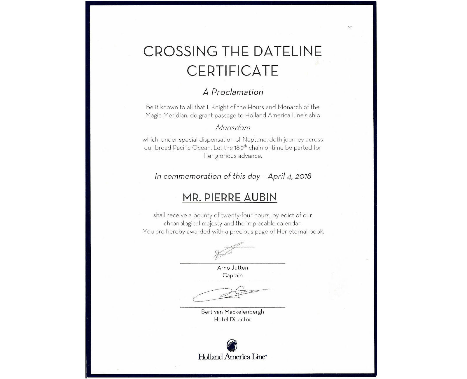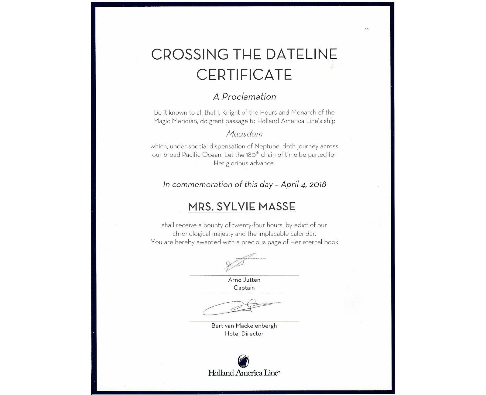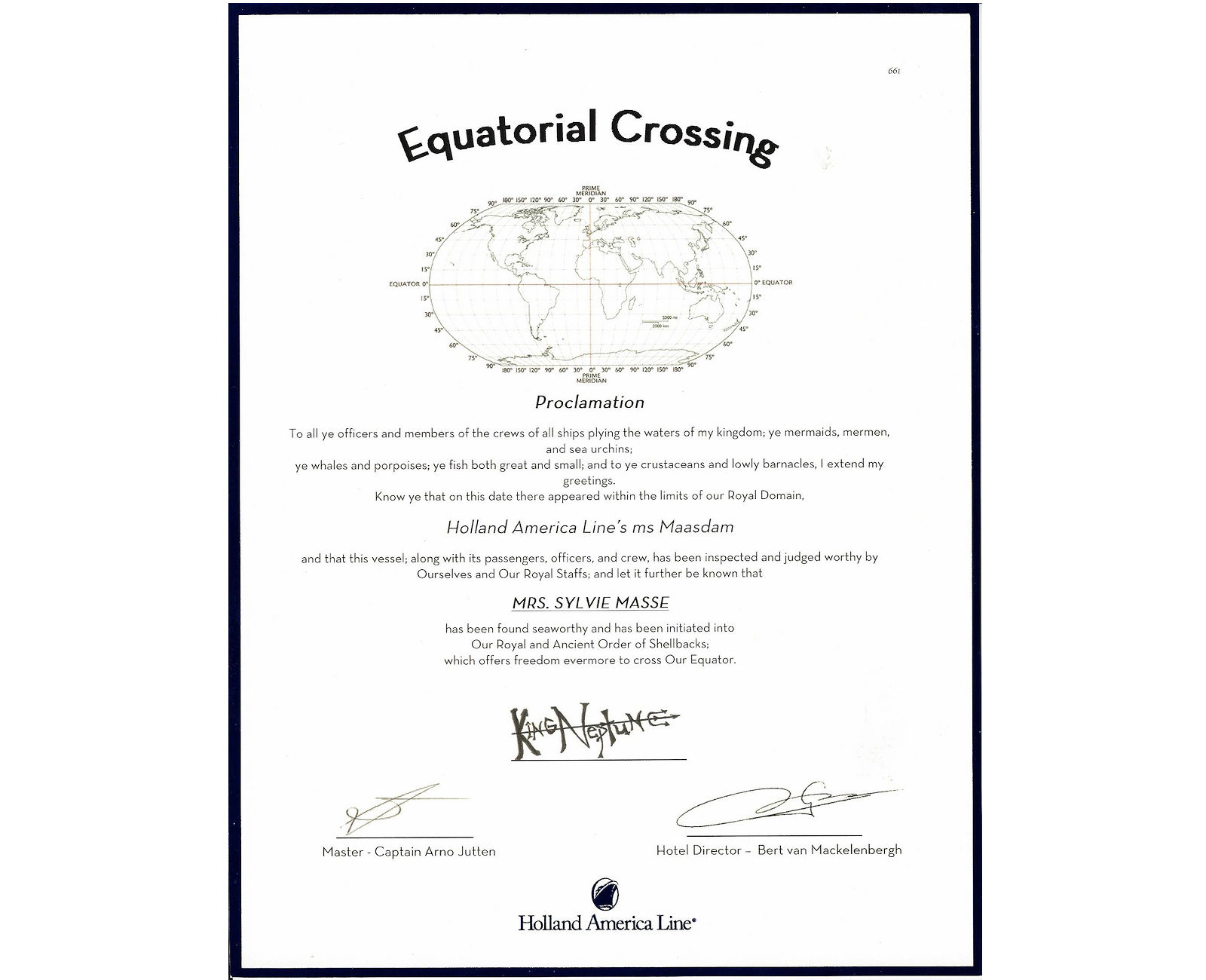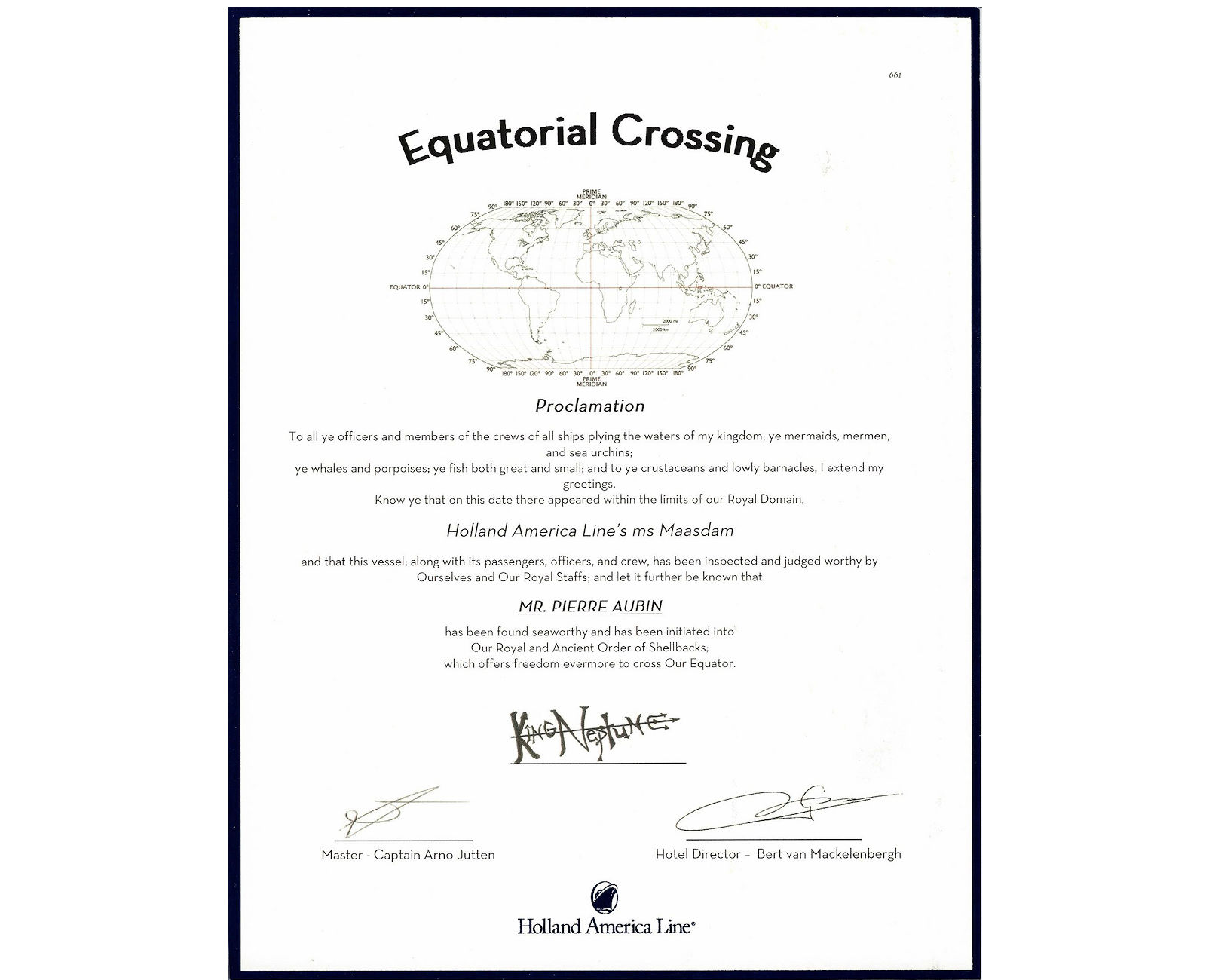 La compagnie de croisière Holland America Line nous a donné des certificats pour avoir traversée la ligne équatoriale et la proclamation spéciale du monarque du méridien magique, le roi Neptune