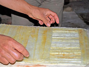 Le principe de fabrication des feuilles de papyrus réside dans la superposition de fines lamelles découpées dans la tige de la plante,